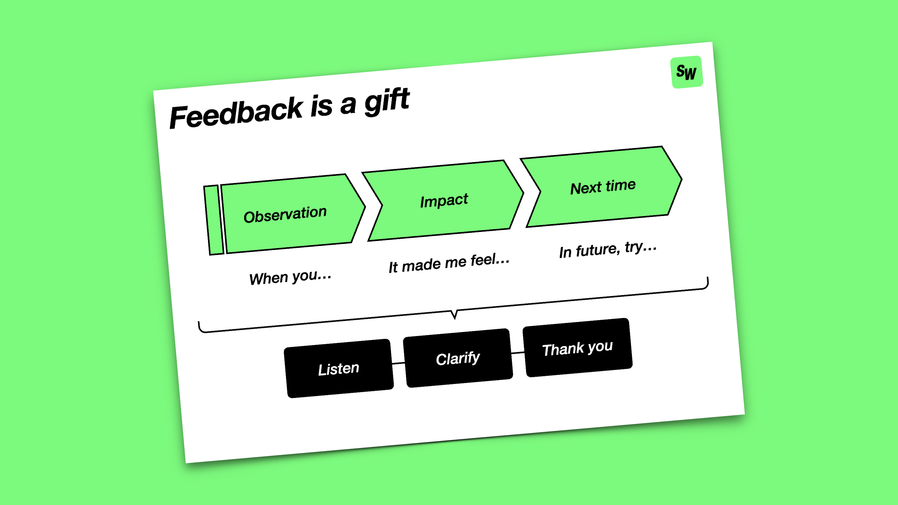 There are lots of feedback frameworks out there. The one I like best is also one of the simplest, and it has the following structure: