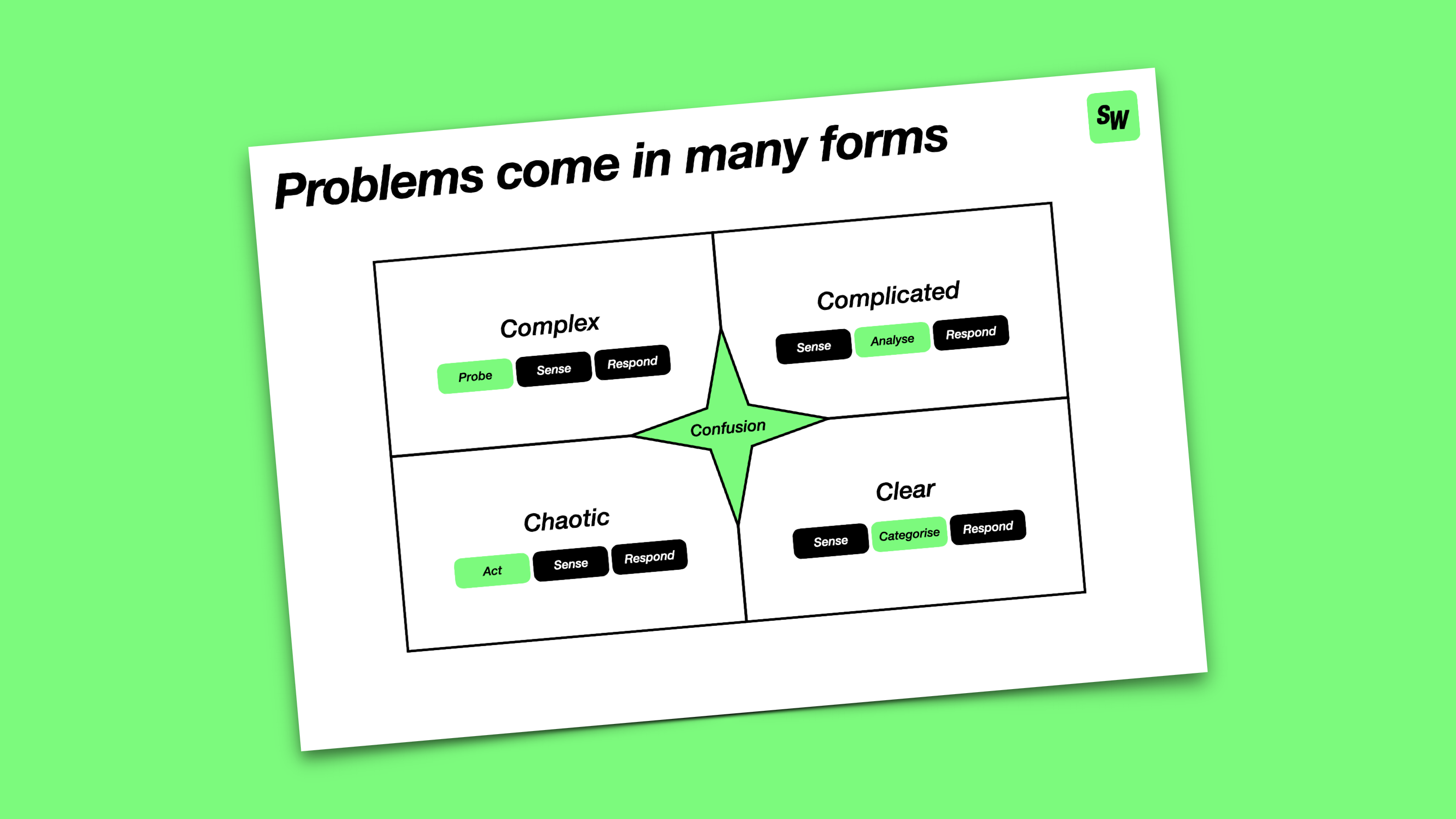 You can probably think of times when you saw someone trying in vain to apply standard processes to a complex problem, or burning goodwill behaving as if a complicated situation was chaotic. Try to avoid doing this!