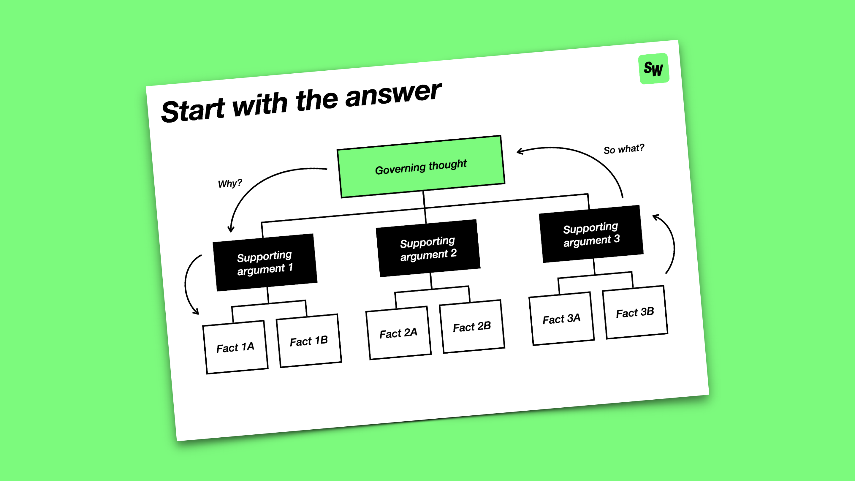 You can check your pyramid is well organised by reading it in both directions. Each step down the pyramid from the top should answer the question “why?”. Each step up the pyramid from the bottom should answer the question “so what?”.