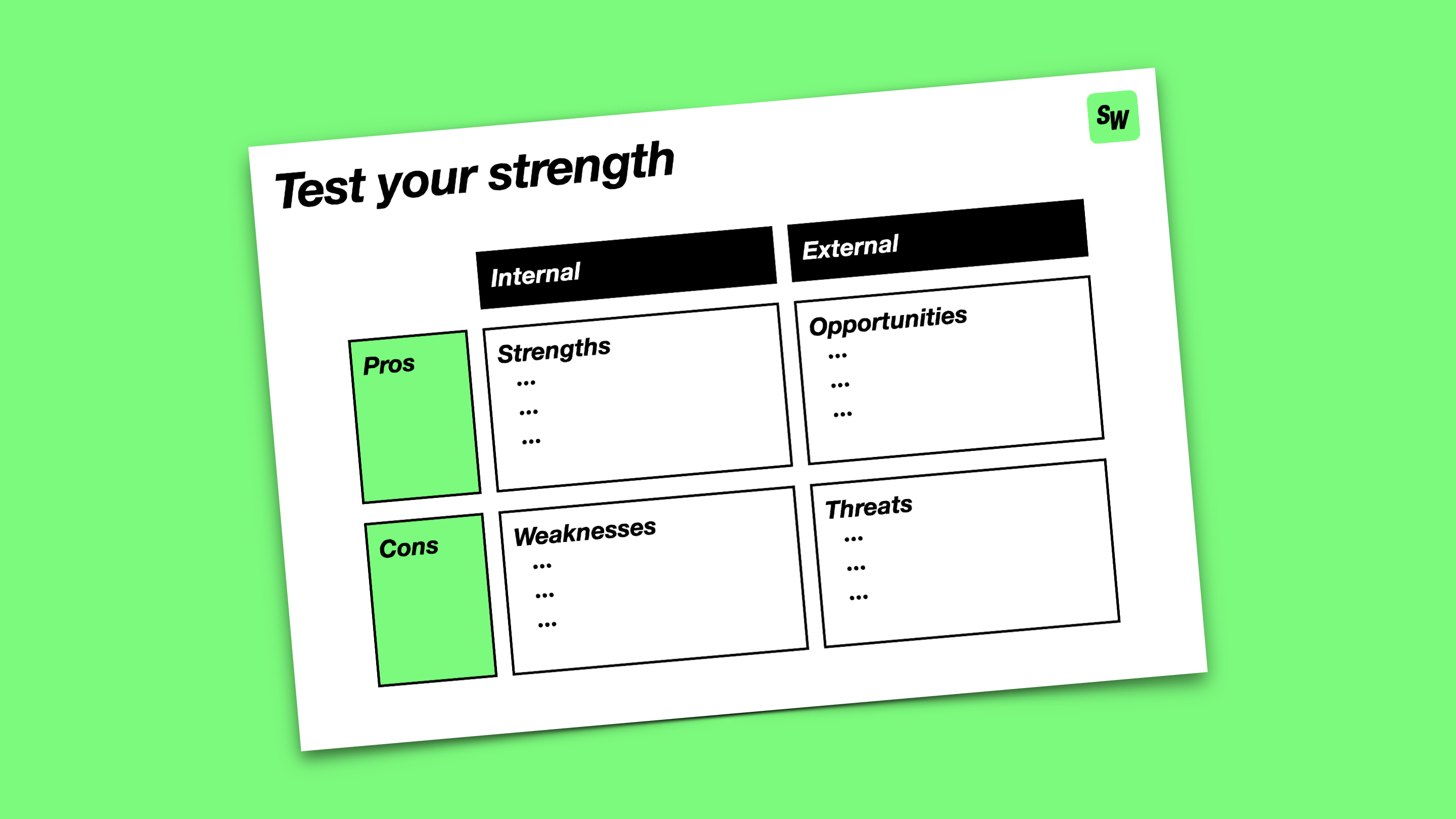 The power of this framework is in forcing you to reflect and be honest about the situation you find yourself in. Too often people jump straight to solutions without a frank assessment of their own capabilities or the environment around them; conducting a thorough SWOT analysis is a good way to ground your decision making first.